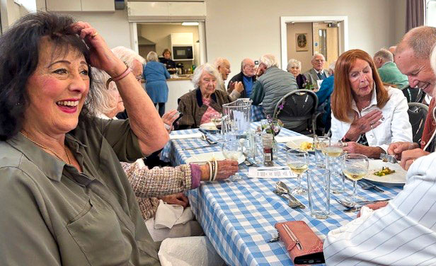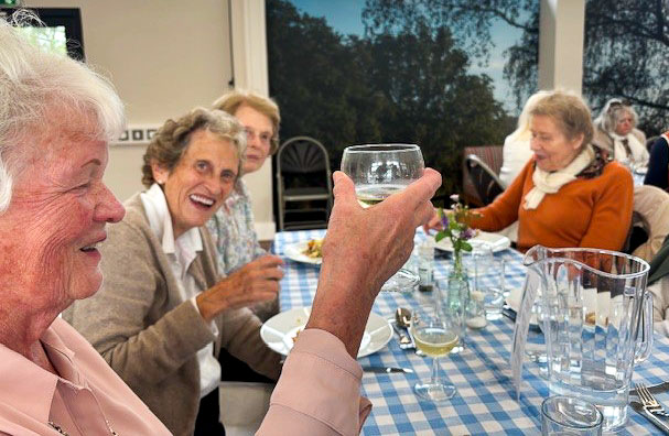 A delicious two course lunch with wine and coffee is prepared and served by a volunteer team of very able and imaginative cooks. The menu is varied – typically meat, chicken, fish, often casseroles and a home cooked dessert.